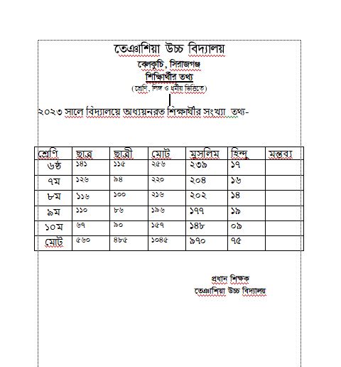 শ্রেণি ও লিংগ ভিত্তিক শিক্ষার্থীর তথ্য